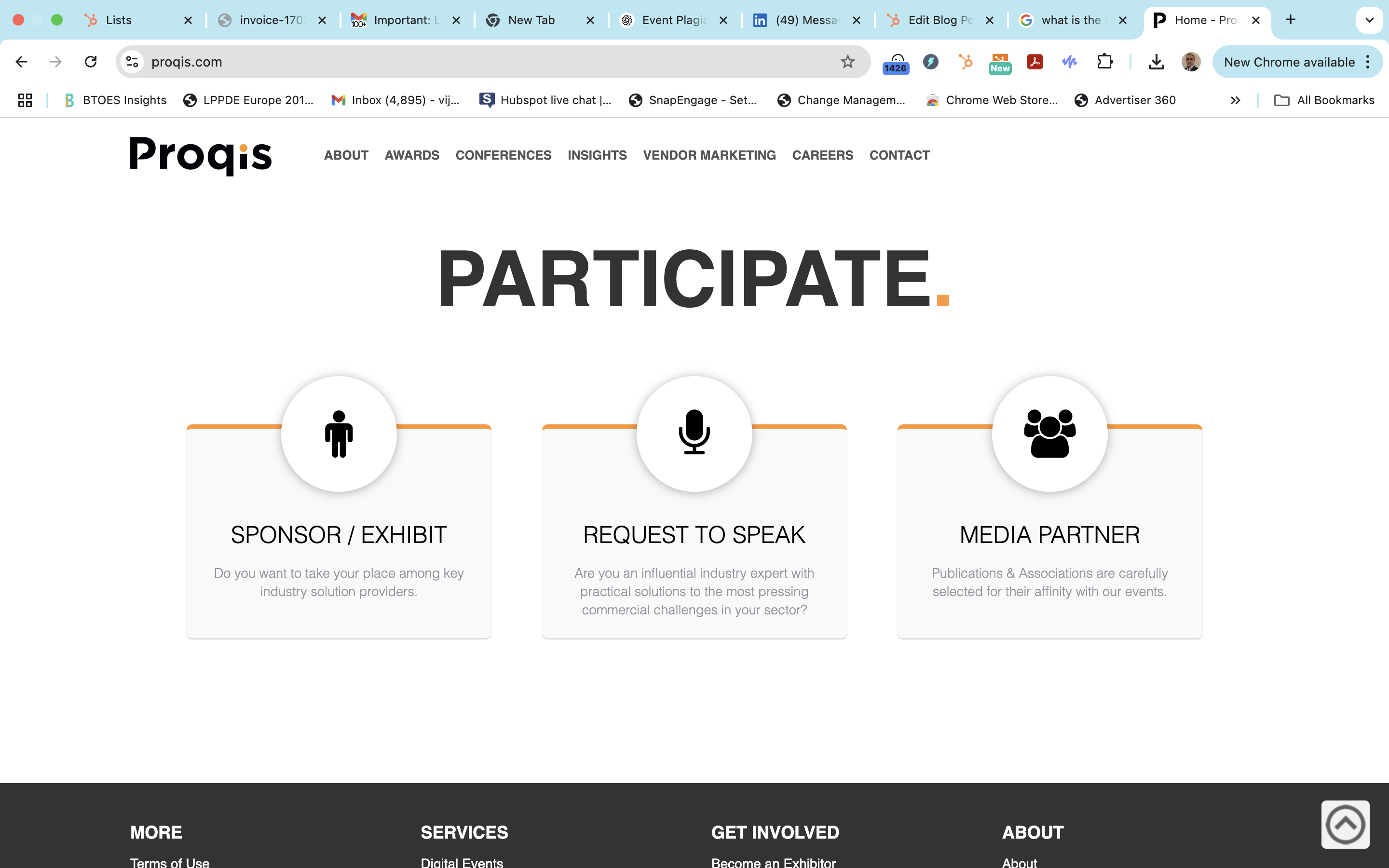 The section from Proqis (our site) titled "PARTICIPATE" — with three separate panels "Sponsor/Exhibit," "Request to Speak," and "Media Partner" — has clearly been copied by BTOPEX, just reworded slightly and reformatted.