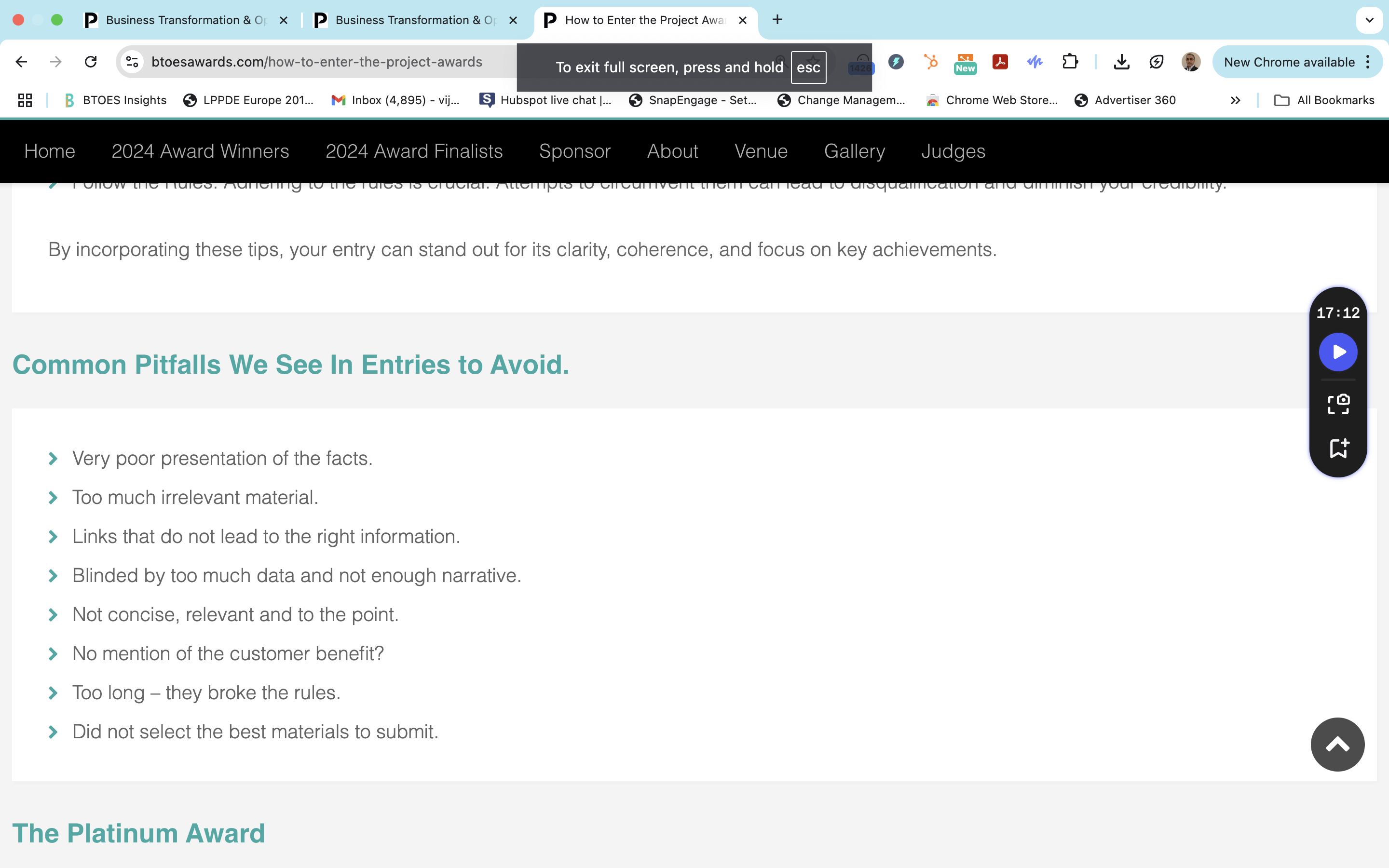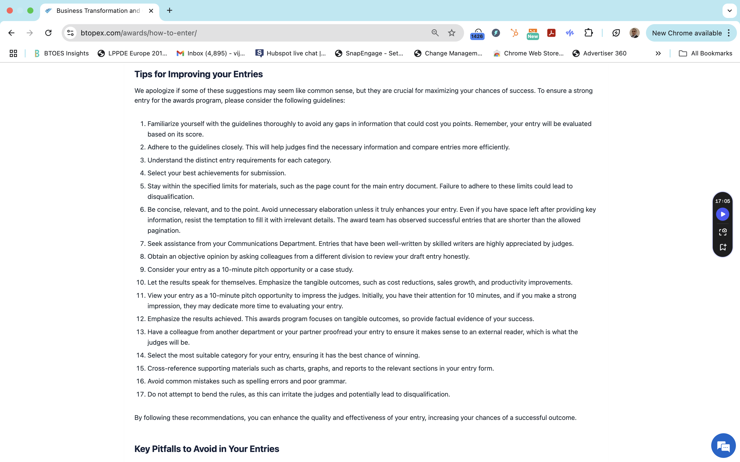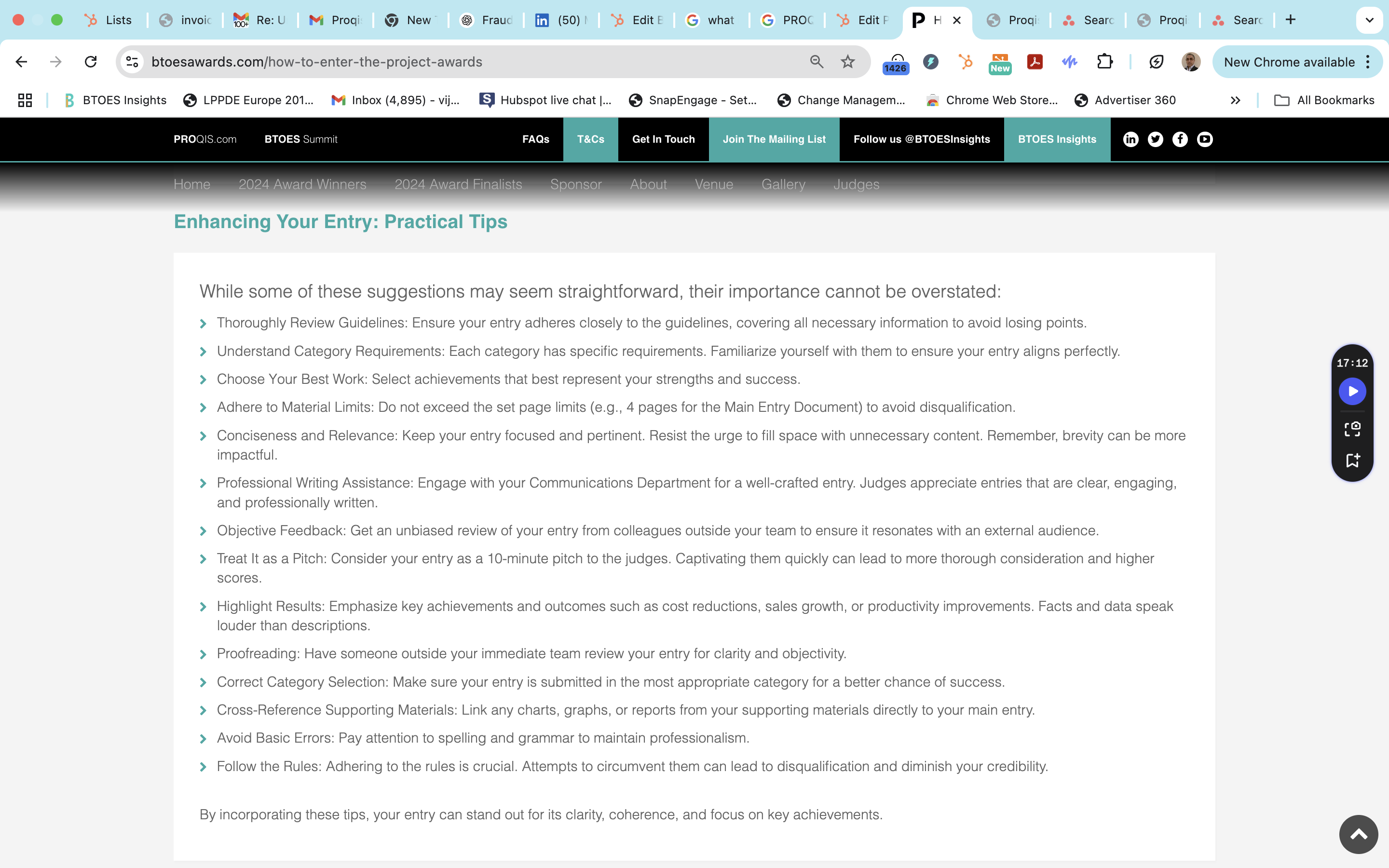 BTOES Awards: Precise copy (reworded) of our tips for improving your entry