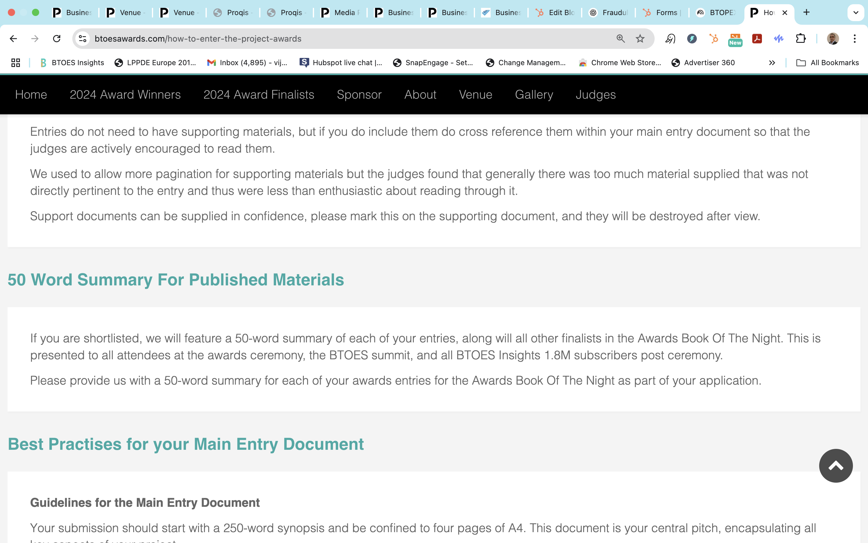 • Full duplication of key awards sections including About the Awards, How to Enter, Key Dates, Entry Fee Structure, Main Entry Document Guidelines, Best Practices, Pitfalls to Avoid, Judges' Code of Conduct, and Terms & Conditions.