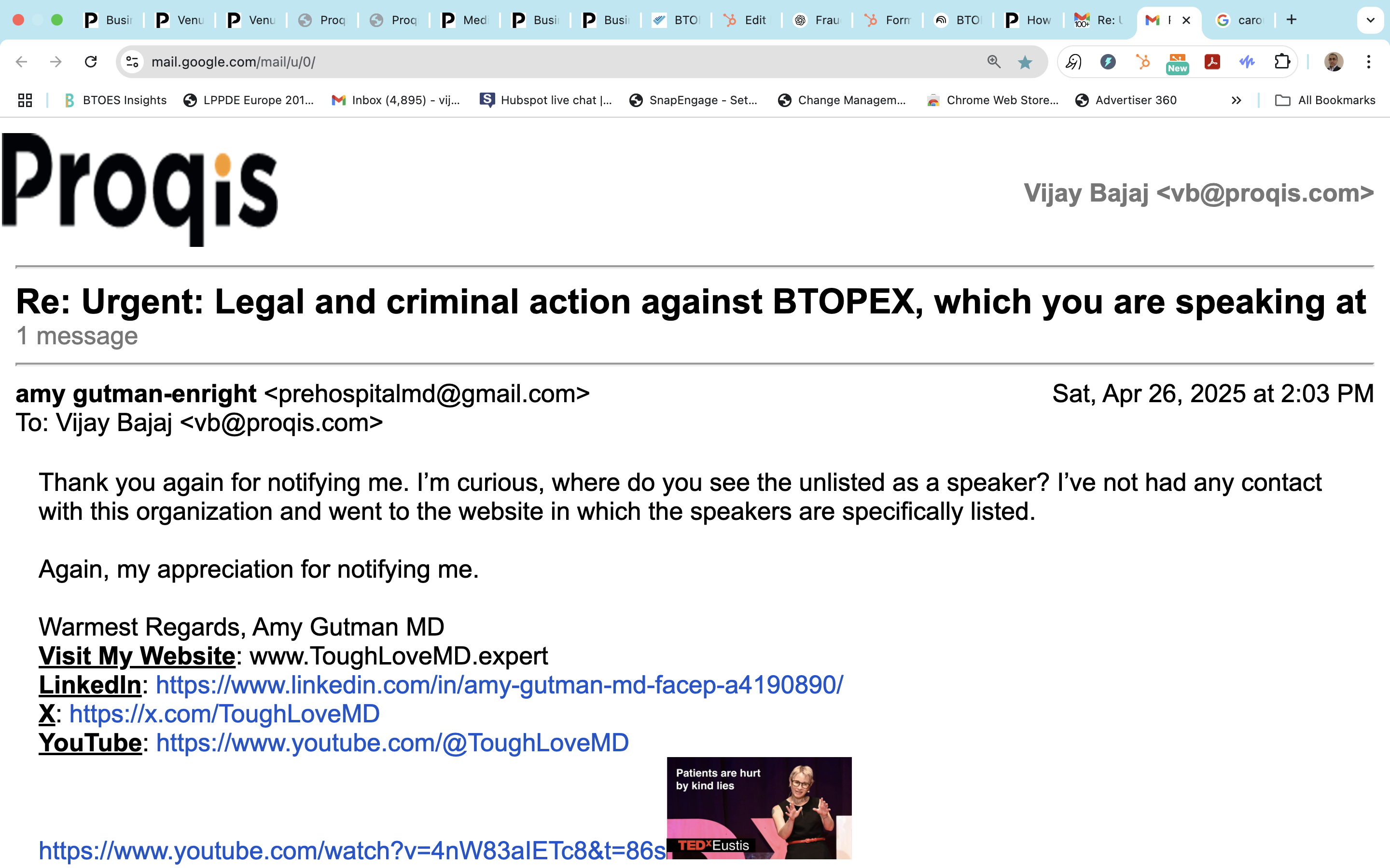 Further evidence Proqis owned the group in 2016 - email to conference producer  Michaela Menezes who I was hiring -  the URL is referenced in the communication